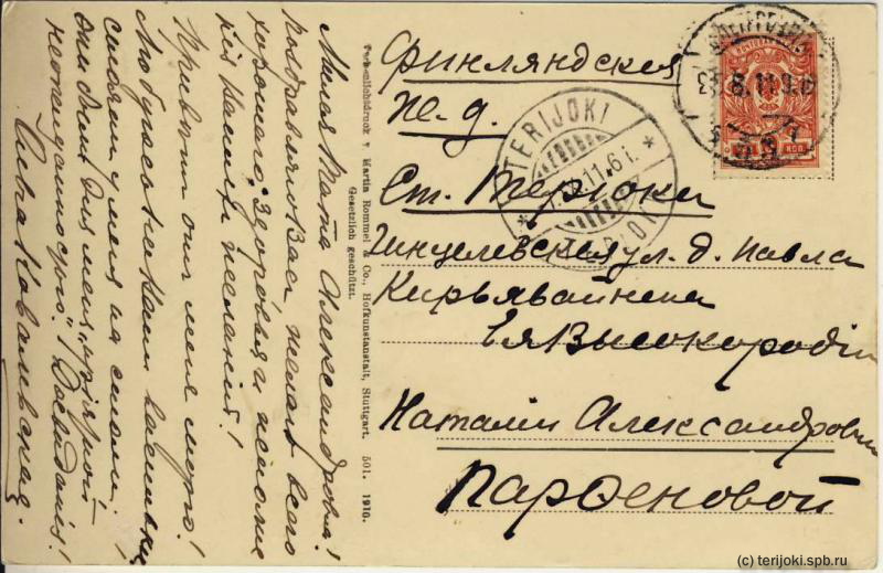 Адрес: Финляндская ж.д., ст. Терийоки, Гинцелевская ул., д(ача, дом?) Павла Кирьявайнена, Ея Высокородию Наталии Александровне Парфеновой