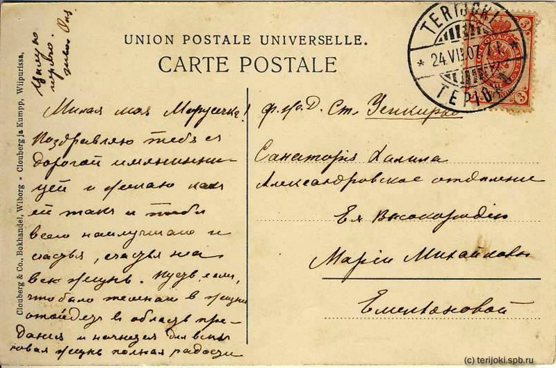 Адрес: Финл. ж.д., Ст. Усикирко, Санатория Халила, Александровское (женское, прим. С. Ренни) отделение, Ее Высокородию Марии Михайловне Емельяновой.