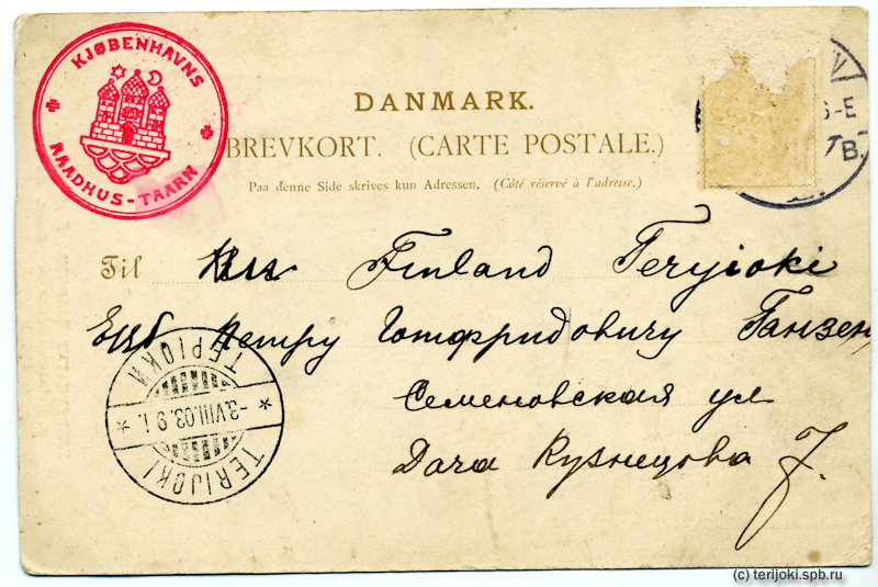Штемпель получателя (Терийоки): 03.08.1903 (дата по новому стилю).