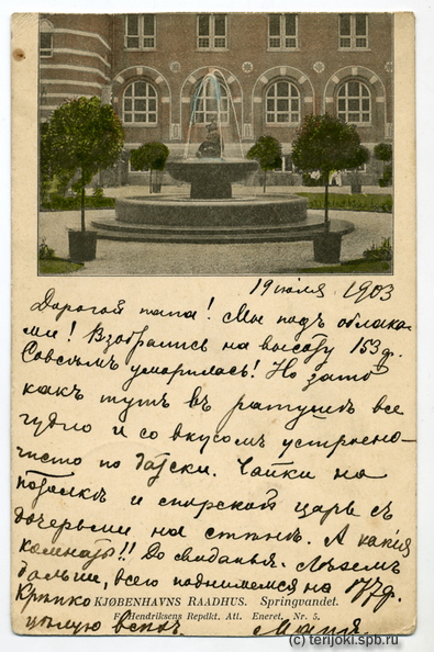 Дорогой папа! Мы над облаками! Забрались на высоту 153 ф[утов]. Совсем уморилась! Но зато как тут в ратуше все чудно, и со вкусом устроено, чисто по-датски. Чайки на потолке и морской царь с дочерями на стене. А какие комнаты! До свидания. Лезем дальше, всего поднимемся на 177 ф[утов]. Крепко целую всех. Маня.