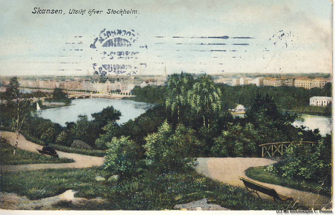 Шлём привет из Стокгольма. На открытке изображен кусочек острова Скансен и открывающийся за ним вид на Стокгольм, преимущественно набережную, где у меня (нрзб.). Крепко целую, М. В(?)
