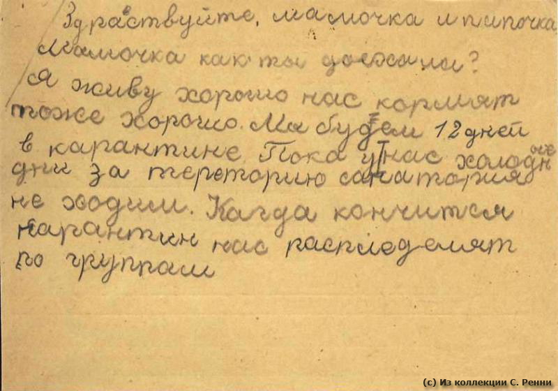 Здравствуйте, мамочка и папочка. Мамочка, как ты доехала? Я живу хорошо. Нас кормят тоже хорошо. Мы будем 12 дней в карантине. Пока у нас холодные дни, за территорию санатория не ходим. Когда кончится карантин, нас распределят по группам.
