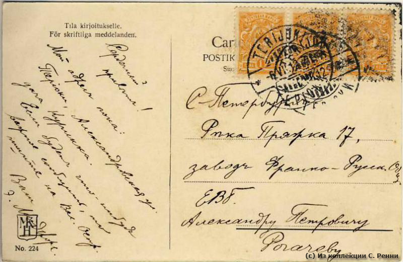 Сердечный привет! Мой адрес пока: Териоки, Александровская улица, дача Курикка. Если будет что-нибудь важное сообщить, то пишите на Вас[ильевский]. Остр[ов]. Ваш Э. Линдфорс.