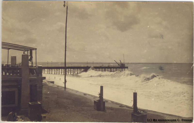 Целую тебя, дорогая Груша, за письмо. Папаша чувствует себя хорошо, берет ванны. Уговорил здесь остаться до 6-го июля. Прошу к тому времени начать ат(т)аку письма о Кирсановской жаре, пыли и опасности (нрзб) приливов. Это помогает. Я купаюсь и вообще дышу понемногу. Поцелуй Олю. Пишу на открытке своей работы "Прибой волн" красивая картина. Любящий тебя Иван Кож[евников].
