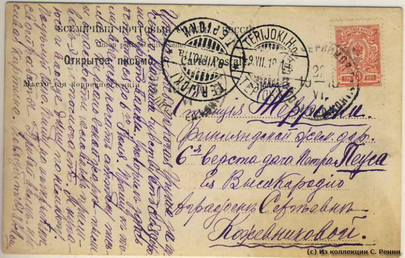 Штемпель транзитный (Терийоки): 09.07.1910 (дата по новому стилю).