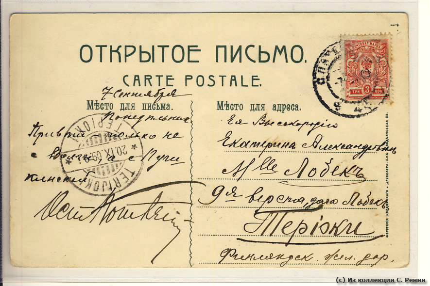 Адрес: Е.В.Р. Екатерина Александровне m-lle Лобек, 9-я верста, дача Лобек, Терийоки, Финляндская ж. д.