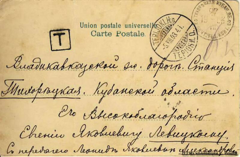 Адрес: Владикавказская ж.дор., ст. Тихорецкая Кубанской обл. ЕВБ Евгению Яковлевичу Левицкому для передачи Леониде Яковлевне Александровой (см. адресную сторону открытки).