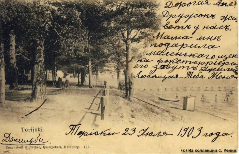 Справка: Одна из трех открыток (см. вторую и третью), отправленных из Терийоки летом 1903 года Женей Дориомедовой (Дорiомедовой) с дачи, находящейся на 4-6 версте по Большому шоссе, своей подружке Ане Александровой, которая отдыхала на ст. Тихорецкая на Кубани.