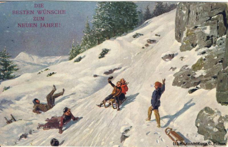 Изображение: На иллюстративной стороне открытки - дети катаются со снежной горки на санках и надпись по-немецки "Наилучшие пожелания с Новым Годом".