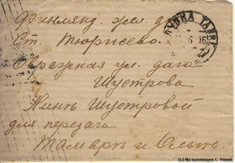 Адрес: Финл. ж.д. ст. Тюрисево. Овражная ул. Дача Шустрова. Нине Шустровой для передачи Тамаре и Ольге (см. адресную и оборотную сторону конверта).