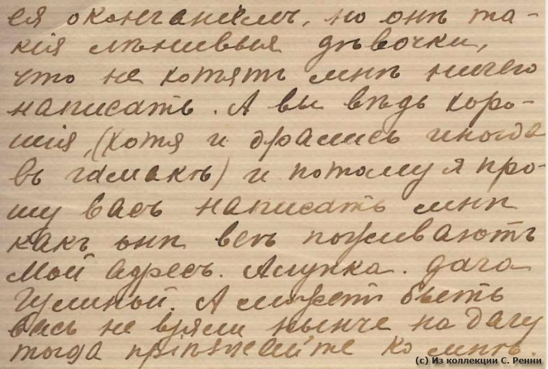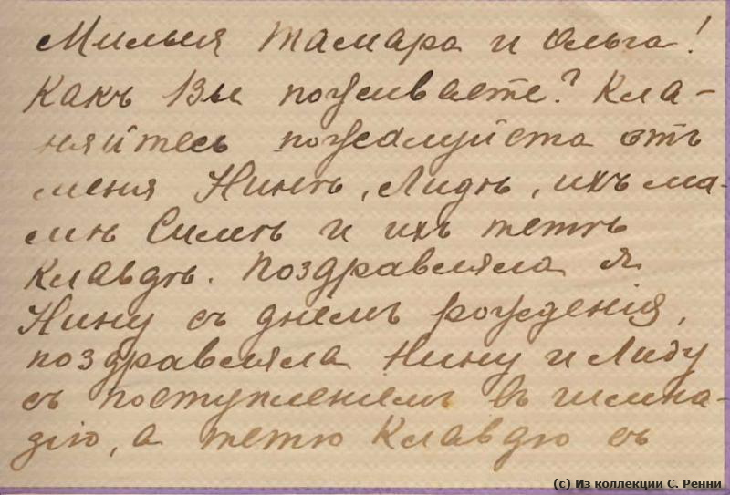 Милые Тамара и Ольга! Как вы поживаете? Кланяйтесь, пожалуйста, от меня Нине, Лиде, их маме Симе и их тете Клавде. Поздравляла я Нину с днем рождения, поздравляла Нину и Лиду с поступлением в гимназию, а тётю Клавдю с ее окончанием, но они такие ленивые девочки, что не хотят мне ничего написать. А вы ведь хорошие девочки (хотя и дрались иногда в гамаке), и потому я прошу вас написать мне, как вы все поживаете. Мой адрес: Алупка, дача Гулиной. А может быть вас не взяли нынче на дачу, тогда приезжайте ко мне.