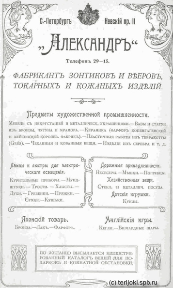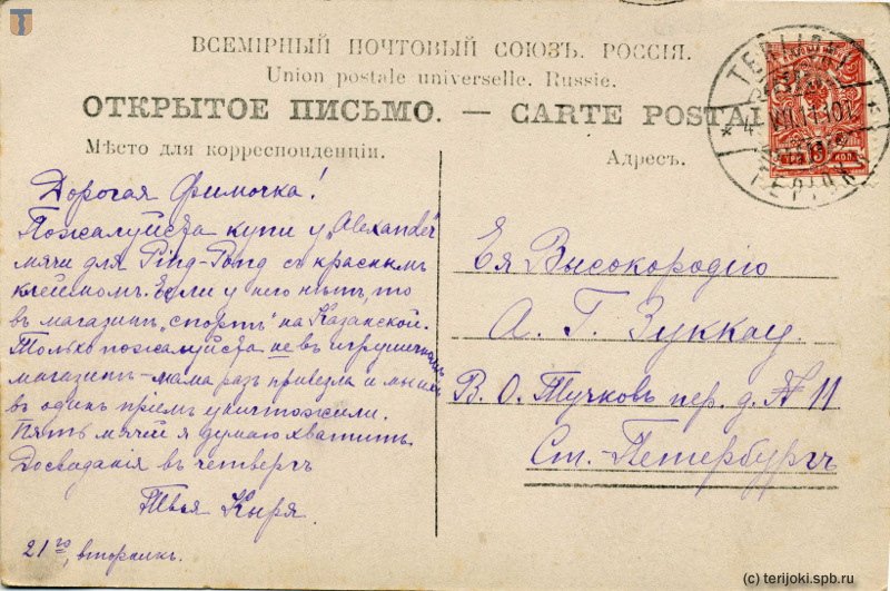 В тексте письма упоминается магазин "Александр", где нужно было купить "мячи для Ping Pong с красным клеймом". Кыря, автор письма, и адресат Алиса-«Фимочка» - девушки не простые. "Александр" в то время - магазин чрезмерно дорогой «всякой всячины» в самом начале Невского проспекта, см. рекламу магазина за 1910, 1911 и 1916 годы.