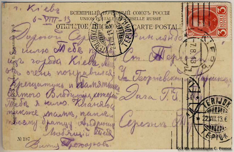113. Открытка, отправленная в августе 1913 г. из Киева в Терийоки С. Тумим.