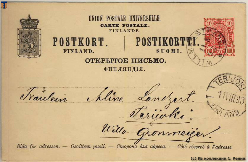 Штемпель отправителя (Виллманстранд): 11.08.1893 (дата по новому стилю).