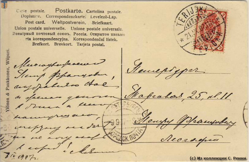 Штемпель отправителя (Терийоки): 21.09.1907 (дата по новому стилю).