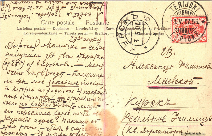 Штемпель отправителя (Терийоки): 13.05.1907 (дата по новому стилю).