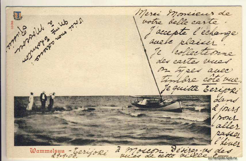 Благодарю Вас, месье, за Вашу открытку; с удовольствием продолжу обмен. Я коллекционирую видовые открытки с марками на лицевой стороне. Через два дня я уезжаю из Терийоки в Москву на всю зиму. Хотели бы Вы получить виды этого города?