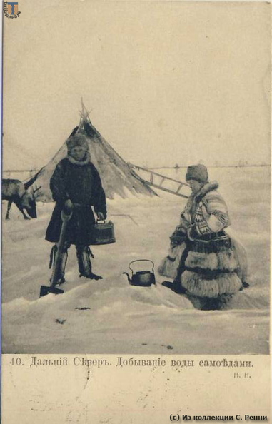 Изображение: На иллюстративной стороне открытки из этнографической серии «Народы севера России» - Дальний Север, добывание воды самоедами.