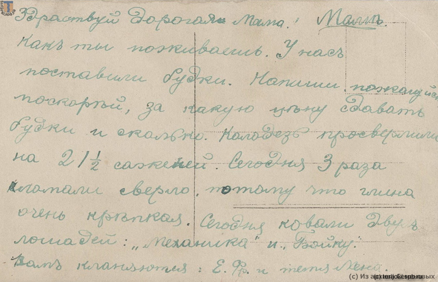 Здравствуй, дорогая мама! Как ты поживаешь. У нас поставили будки. Напиши, пожалуйста, поскорей, за какую цену сдавать будки и сколько. Колодезь просверлили на 21 ½ саженей. Сегодня три раза ломали сверло, потому что глина очень крепкая. Сегодня ковали двух лошадей: «Механика» и «Бойку». Вам кланяются Е. Фр. и тетя Лена.