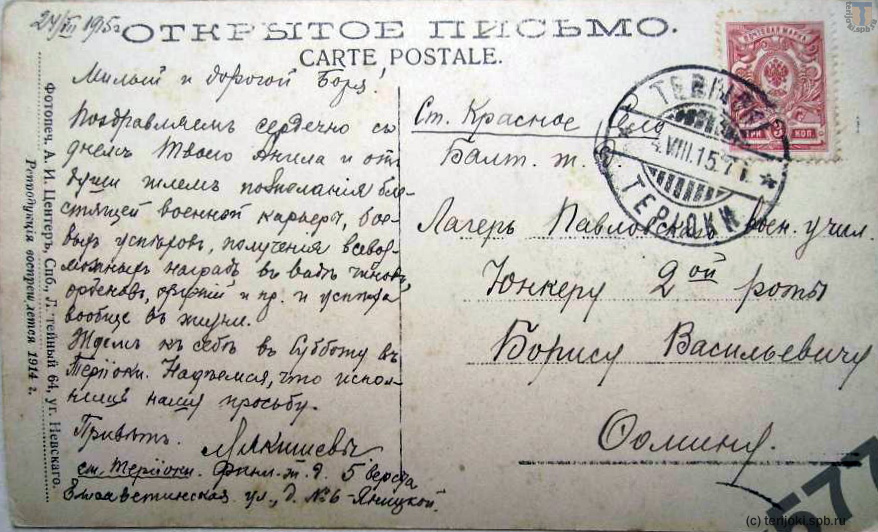 Штемпель получателя (Терийоки): 04.08.1915 (дата по новому стилю)