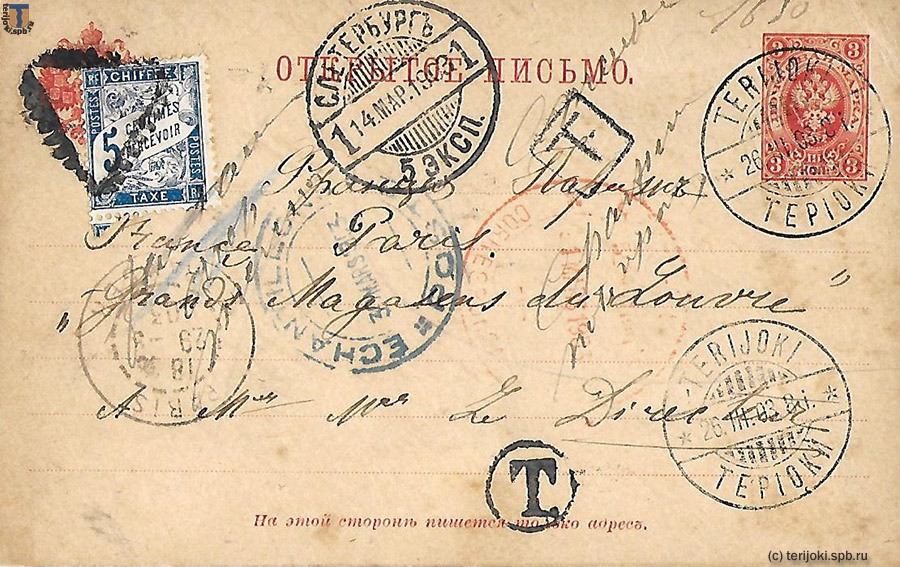 Справка: Вместо 4 коп. открытки отправили 3 коп. Работник почты в Териоках ставит штампик "Т" – надо взыскать с получателя 2 коп. Далее транзитный штемпель почты С.-Петербурга. Открытка приходит в Париж. Французский почтальон проявляет "солидарность" с финским коллегой и ставит свой штампик доплаты "Т" (тот, что внизу). Получателя заставляют оплатить разницу – тому свидетельство доплатная марка в 5 сентимов, погашенная характерным треугольным штампом. Еще виден явно не почтовый оттиск – штамп, возможно, магазина-получателя корреспонденции.