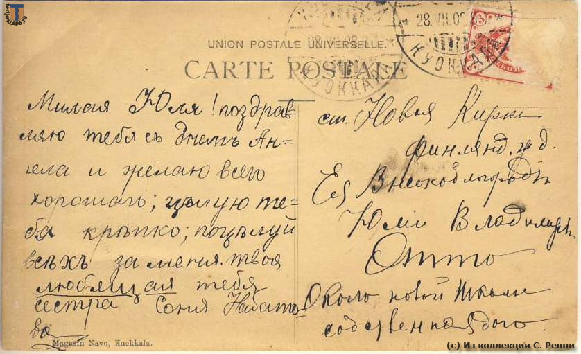 Адрес: ст. Новая Кирка Финлянд. ж.д. Ее Высокоблагородию Юлии Владимировне Отто. Около новой школы, собственная дача.
