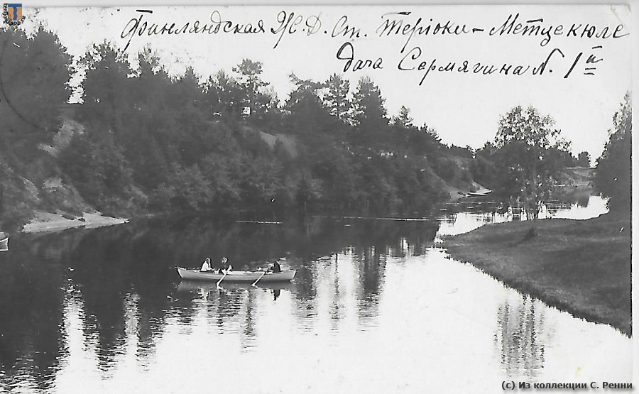 Изображение: На иллюстративной стороне открытки - вид на Черную речку в Ваммельсуу. Подпись от руки: Финляндская ж.д., ст. Метцекюле. Дача Сермягина №1-й.