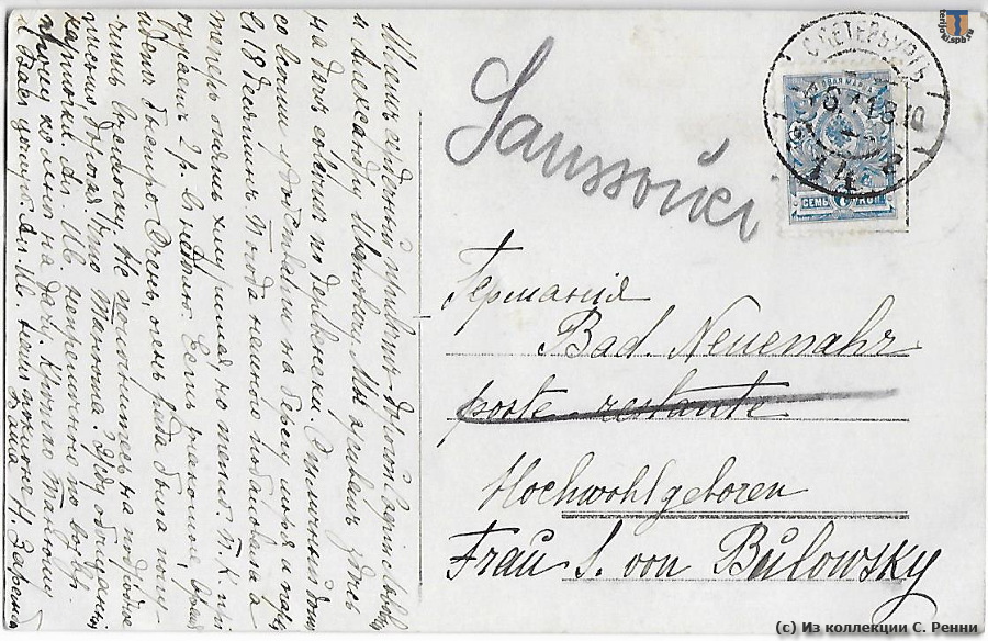Справка: Адресаты – статский советник Александр Иванович Буловский и его жена София Львовна, проживавшие на Литейном, 33. Александр Иванович служил в отделе казенной продажи питей ("Весь Петербург" на 1911 год).